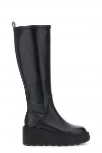 Stivali in pelle con gambale elasticizzato effetto leather look grintoso e moderno dona slancio alla silhouette. tacco 7,5 cm e plateau 4 cm comfort e stile a ogni passo.