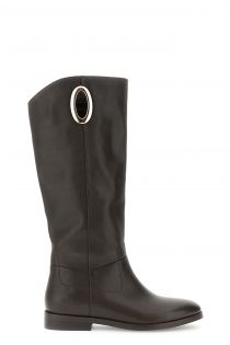 Stivali in pelle nera con elegante accessorio ovale dorato. fodera in tessuto soletto in pelle e tacco basso da 2,7 cm. design sofisticato per look femminili e versatili.