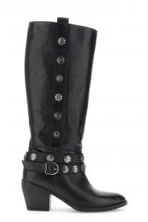 Stivale in pelle con bottoni decorativi e cavigliera removibile per un tocco bold. fodera e soletto in pelle tacco largo e svasato alto 7cm. carattere rock anima sofisticata.