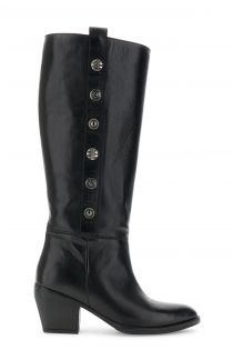 Stivali in pelle nera con maxi bottoni in metallo: dettagli punk e anima ribelle. interno in pelle tacco block 7 cm per dominare la città con stile.