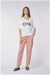 T-shirt ampia con spacco dietro in jersey di cotone con stampa e ricamo floreale