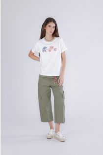 T-shirt da donna in jersey di cotone elasticizzato con vestibilità regolare. scollo rifinito con rib smerlata in lurex e maniche corte. stampa frontale con fiori e logo in delicati colori pastello. la modella è alta 175 cm e indossa la taglia s. vestibilità: regular.