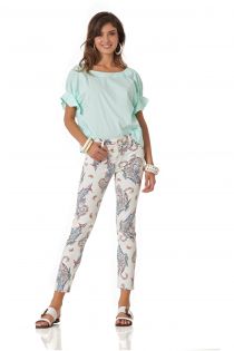 T-shirt in popeline di cotone con un ampio scollo e delle particolari maniche adornate al fondo con un godet che crea un delicata e vaporosa asimmetria.
