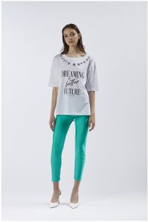 T-shirt realizzata in jersey di cotone. scritta "dreaming a better future" e applicazioni alla scollatura di fiori e foglie in strass. le maniche sono al gomito.
