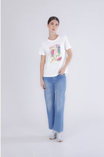 T-shirt donna in jersey di cotone elasticizzato con maniche corte morbida e confortevole. la stampa multicolor è arricchita da strass e ricami decorativi per un look estivo femminile e di tendenza. la modella è alta 175 cm e indossa la taglia s. vestibilità: regular.