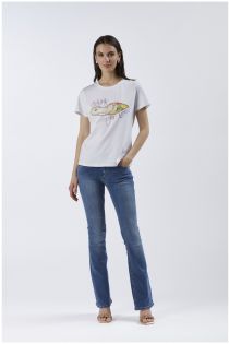 T-shirt a maniche corte in jersey di cotone elasticizzato che riproduce la stampa di una scarpa vista dall'alto.