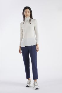 T-shirt modello dolcevita realizzata in un tessuto misto seta. Le cuciture sono a contrasto colore.