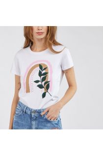 T-shirt in jersey di cotone dal gusto vagamente etnico con un ramage di foglie ricamate che attraversano un arco stampato con colori tenui.