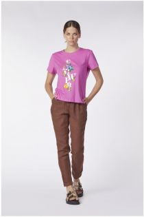 t-shirt in jersey di cotone con stampa e ricamo floreale ciclamino