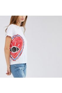 T-shirt in jersey di cotone. Un importante cuore realizzato con una stampa sfumata effetto acquerello e applicazioni di specchietti riempiono il davanti e il dietro