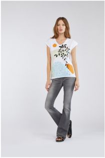 T-shirt in jersey di cotone elasticizzato con un mix di stampa e ricami che decorano il davanti con soggetti dal gusto etno chic