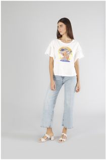 T-shirt dalla vestibilità a scatolina a maniche corte tipo ruches realizzata in jersey di cotone elasticizzato.la stampa riproduce un primo piano femminile con cappello.