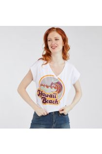 Mare, surf, voglia di estate sono tutte racchiuse in questa t-shirt in jersey di cotone elasticizzato con un mix di tecniche di stampa applicate sul davanti.