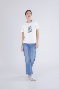 T-shirt donna in jersey di cotone elastico con vestibilità regolare. scollatura rifinita da rib smerlata in lurex e maniche corte. stampa frontale con volto femminile e fiori dai colori vivaci. la modella è alta 175 cm e indossa la taglia s. vestibilità: regular.