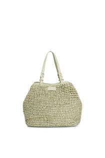 Tote a spalla in crochet fatta a mano chiusura con calamita e passante con moschettone per i fianchi tag con logo in rilievo e lamina dorata.