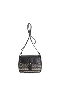Elegante borsa a tracolla con pattina e quadrante frontale in tessuto a rete con infilature. logo a taglio vivo con dettagli cuciti a mano fibbia decorativa tracolla regolabile e chiusura a calamita. perfetta per un look casual chic