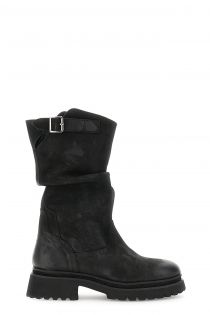 Tronchetti a tubo in nabuk con pieghe morbide e cinturino alla caviglia. soletto in pelle suola carrarmato e tacco da 5,5 cm. stile grintoso per look urban contemporaneo.
