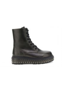 Tronchetti allacciati in similpelle spazzolata metallizzata con soletto in pelle e suola platform decorata da borchie oro e nere. altezza suola 3,5 mm. stile grintoso e attuale.