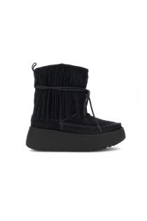 Tronchetti in pelle scamosciata con frange e lacci frontali. fodera e soletto in pelliccia sintetica per un comfort extra. suola platform da 4 cm. stile boho e calore assicurato.