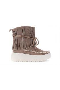 Tronchetti in pelle scamosciata con frange e lacci frontali. fodera e soletto in pelliccia sintetica per un comfort extra. suola platform da 4 cm. stile boho e calore assicurato.