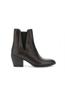 Tronchetto in pelle con elastico laterale silhouette affusolata e cuciture bold. fodera e soletto in pelle tacco largo alto 7 cm. un must-have grintoso per look metropolitani.
