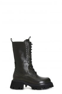 Tronchetti in pelle e borchie con gambale medio e allacciatura. La suola carro armato in materiale extralight slancia la modelleria e la rende iper attuale.
