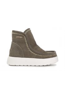 Tronchetti in pelle scamosciata con fodera in similpelliccia. Logo metallico e suola rialzata. Impunture a vista decorano la bordura.