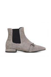 Tronchetti in pelle scamosciata dalla forma sfilata con elastici e morsetto a decoro.