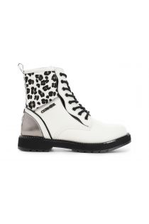 Tronchetti multimateriale con importanti dettagli maculati e logo metallico e guardolo decorato.