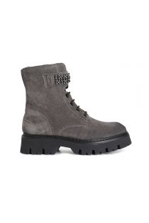 Tronchetto allacciato in pelle scamosciata con accessorio gioiello.cerniera parte interna. il soletto è in pelle. la suola carro armato in materiale extralight slancia la modelleria e la rende iper attuale.