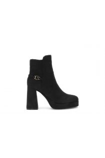 Tronchetto da donna in microfibra con particolare accessorio cafènoir. plateau di 22 mm e tacco alto 100 mm. forma stondata. cerniera interna nella parte interna della calzatura. il soletto è in pelle. il tutto dona equilibrio tra altezza bellezza e comodità.