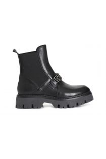 Tronchetto in pelle con elastico e accessorio gioiello. il soletto è in pelle. la suola carro armato in materiale extralight slancia la modelleria e la rende iper attuale.