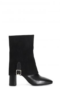 Tronchetto in nappa e camoscio con maxi risvolto e fibbia. modello iconico dalla forma leggermente arrotondata per uno stile innovativo e raffinato. tacco alto 80 mm. il soletto è pelle.