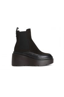 Tronchetto da donna in pelle scamosciata con elastici laterali. tacco 70 mm e plateau 30 mm. il soletto è in pelle.