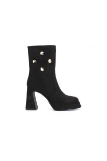 Tronchetto da donna in microfibra con quattro borchie esagonali. calzatura dal perfetto stile seventies il tacco altezza 95mm insieme al plateau di 18mm sono un mix perfetto tra altezza bellezza e comodità.