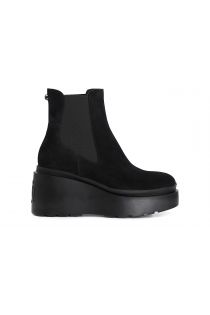 Tronchetto donna in pelle scamosciata con elastici. soletto in pelle e suola con zeppa personalizzata con logo a rilievo sul retro.