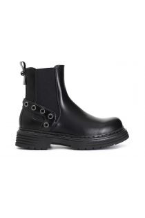Tronchetto donna in similpelle con elastico laterale su gambale e motivo composto da occhielli.
