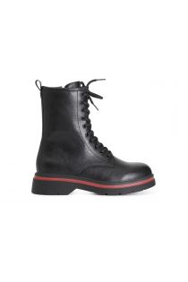 Tronchetto donna allacciato in similpelle di colore nero. suola in gomma con banda colorata di rosso tacco da 40mm.