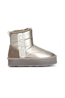 Tronchetto in nylon impreziosito da un nastro con logo cafènoir fatto di strass la fodera è in pelliccia sintetica. plateau alto 35mm