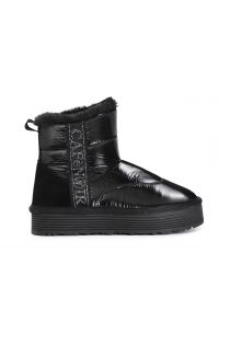 Tronchetto in nylon impreziosito da un nastro con logo cafènoir fatto di strass la fodera è in pelliccia sintetica. plateau alto 35mm