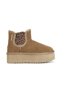 Tronchetto in pelle scamosciata e con elastici stampa maculata. interno in pelliccia sintetica e suola con nuova zeppa alta 35mm.