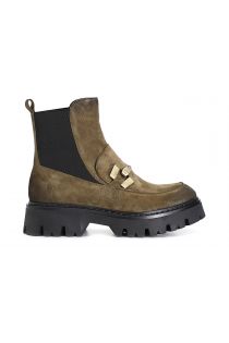 Tronchetto da donna in pelle scamosciata arricchito da un morsetto e con elastico laterale. il soletto è in pelle. modello versatile e dinamico ideale per completare moltissimi outfit.