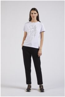 Tshirt a maniche corte in jersey di cotone elasticizzato che riproduce una scritta stampa silver. una catena gioiello decora la scollatura.