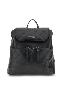 Zaino con pattina e tasche frontali con tiralampo con logo lettering. stampa logo embossed all over. tasca interna con zip. chiusura con cerniera e calamita. spallacci regolabili.