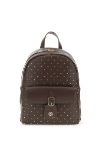 Zaino in similpelle con tasca frontale dotata di pattina e fibbia decorato con microborchie per un look moderno e grintoso perfetto per ogni giorno.