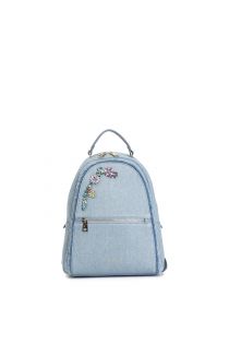 Zaino in denim sfrangiato con fiori di pietre e strass. ampia tasca frontale con zip. zaino con unico scomparto. spallacci regolabili.