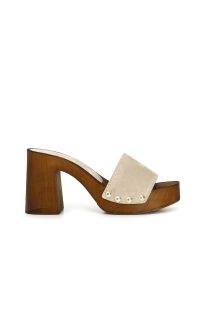 Zoccoli con fascia in crosta disponibile in 6 colori. plateau e tacco medio in legno scuro e sottopiede in suede che riprende il colore della fascia.