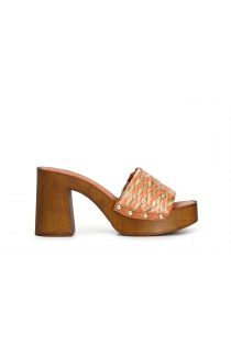 Zoccoli con tacco in legno e fascia decorativa in rafia intrecciata bicolore.