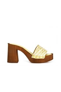 Zoccoli con tacco in legno e fascia decorativa in rafia intrecciata bicolore.