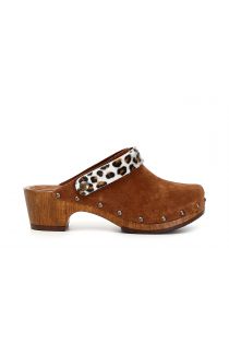 Zoccoli sabot in pelle scamosciata con riporto in cavallino maculato. zeppa su tacco medio.